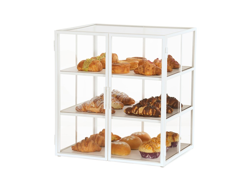 Add a unique look to any bakery, coffeehouse, or buffet presentation with this all-white ultra modern Juno Case. The durable metal frame features a paneled design which provides a unique touch to a visually striking piece! Available only is self serve, the magnetic-closure doors help to keep food and pastries of all kinds, fresh!