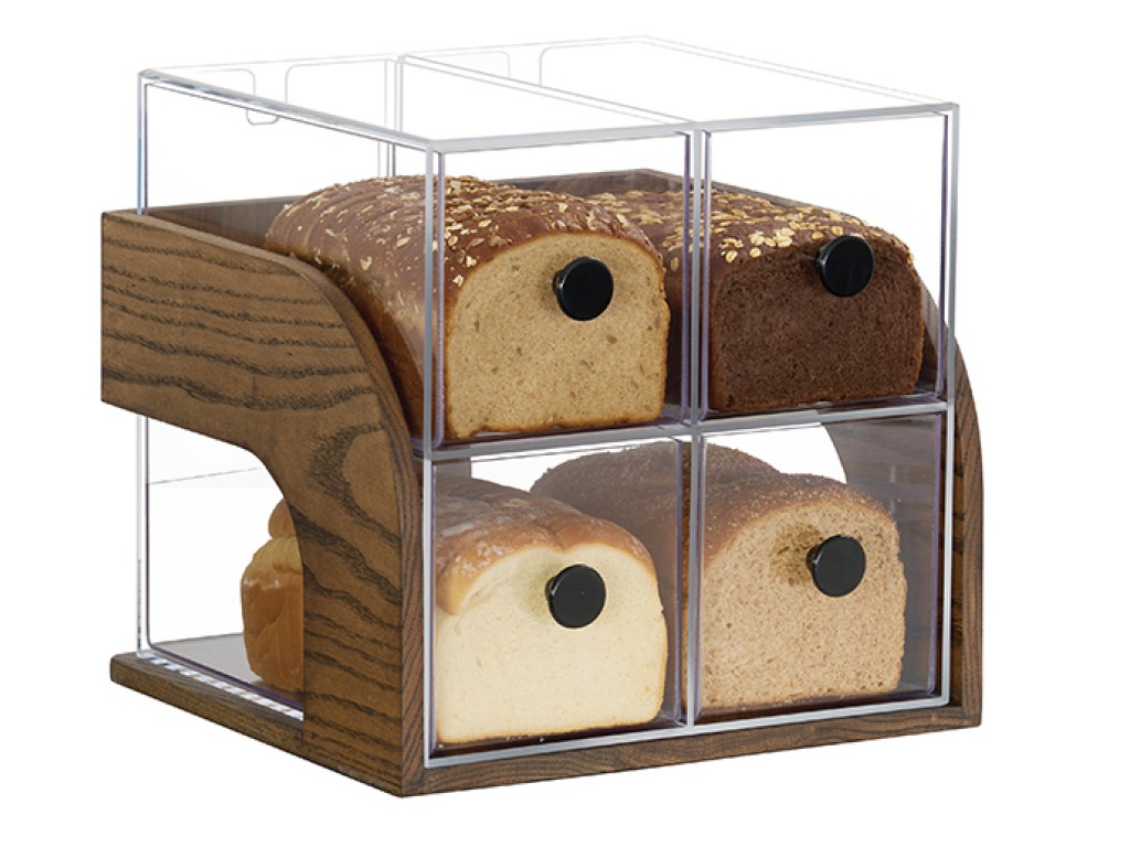 Showcase baked goods in the Melrose Collection bread case, featuring rich chocolate oak-stained wood, sculpted curved sides, and black knob details. A refined, eye-catching solution for elegant bakery and countertop displays.