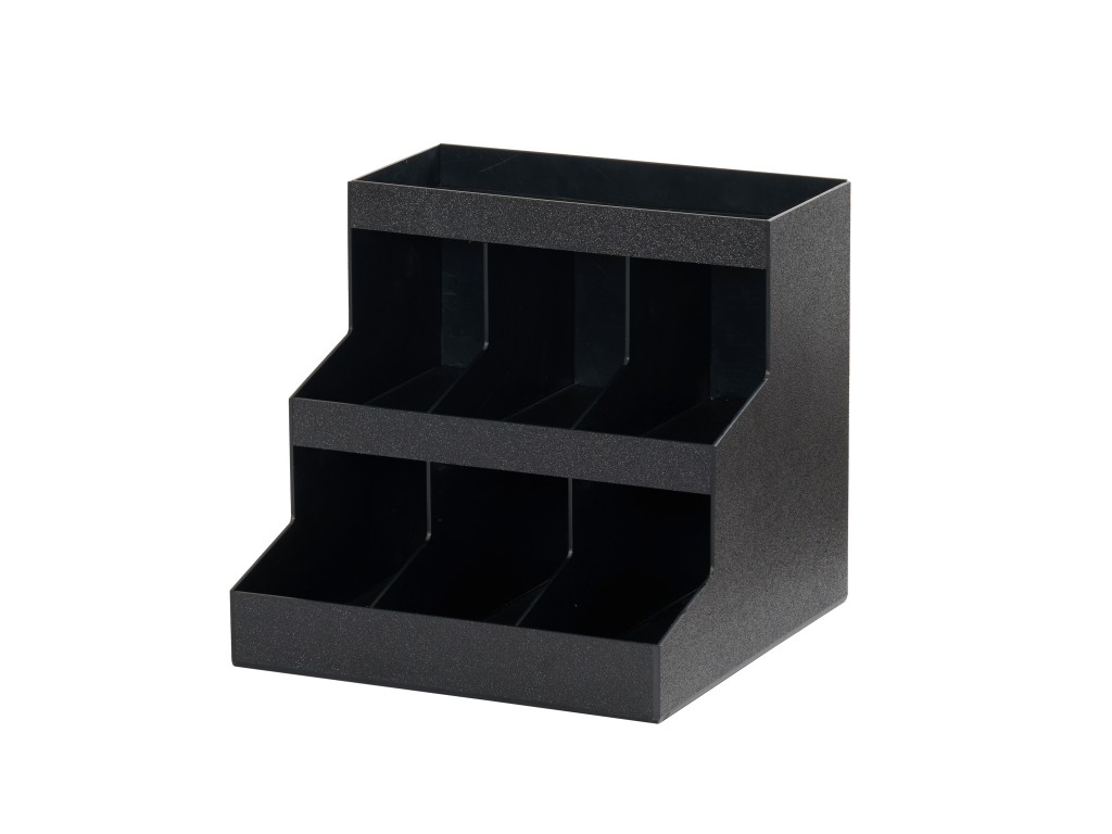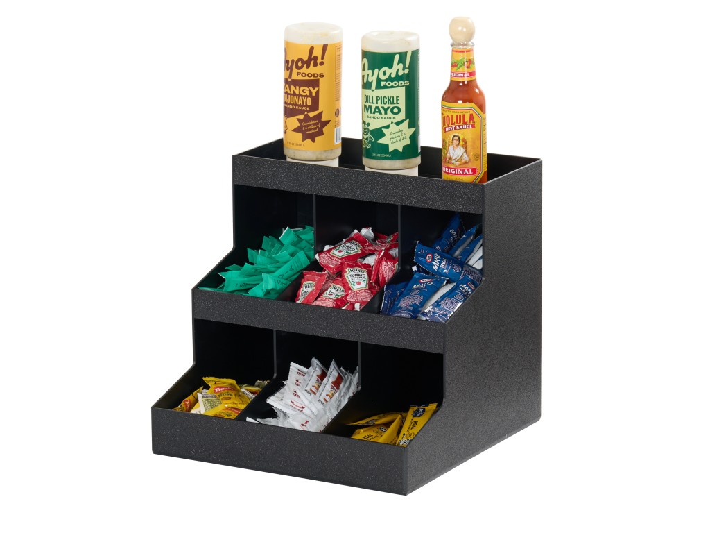 Keep counters neat and organized with this Classic 2-Tier Condiment Organizer. Made from sturdy black ABS, its tiered design maximizes space while providing easy access to packets, toppings, and sauce bottles in high-traffic environments.