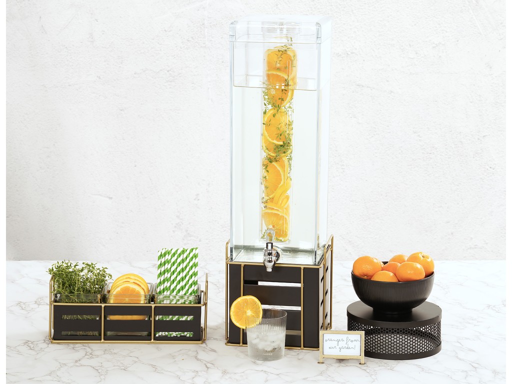 The luxurious look of black and gold help to make this Beverage Dispenser a truly unique look! With geometrical cutouts on the metal base adding a touch of space to the dispenser, the gold wire frame with handles helps to allow for easy transport.