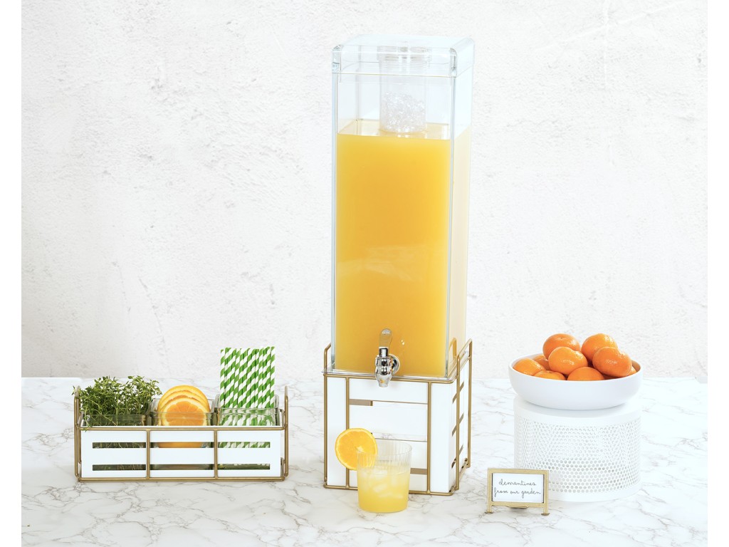 The luxurious look of white and gold help to make this Beverage Dispenser a truly unique look! With geometrical cutouts on the metal base adding a touch of space to the dispenser, the gold wire frame with handles helps to allow for easy transport.
