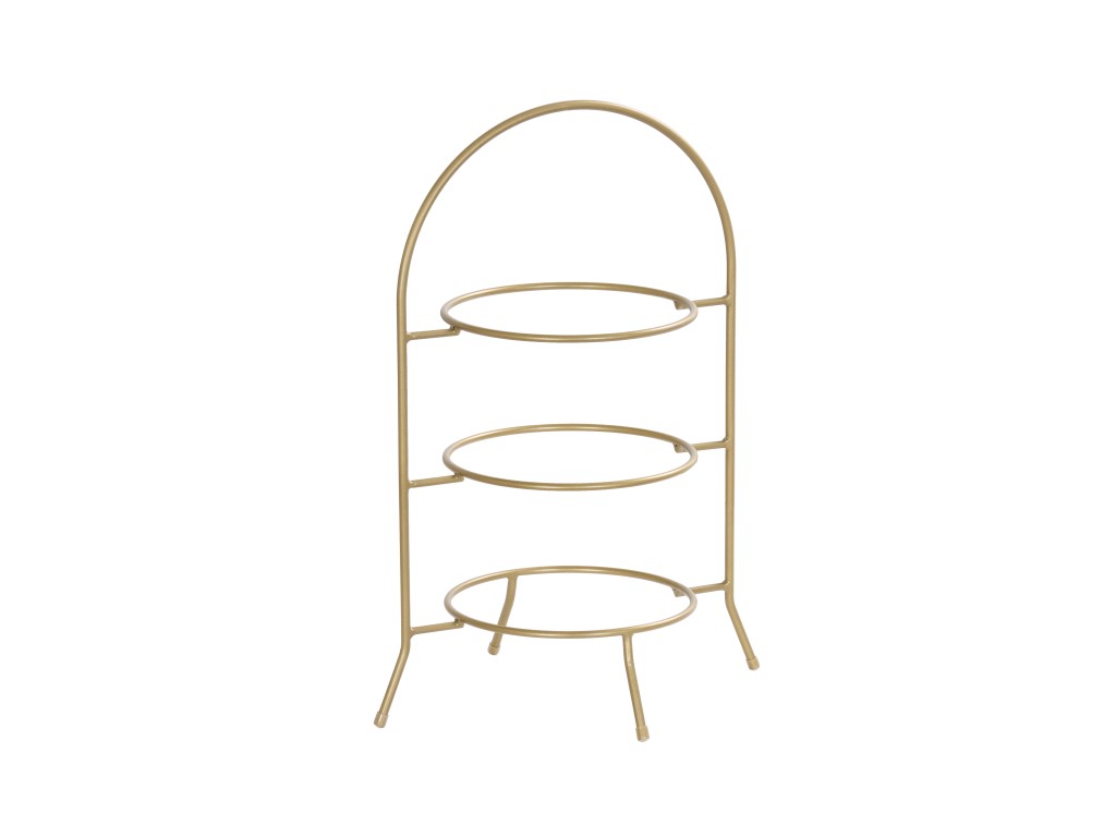 This three tiered display features a matte gold finish & a modern arched design and can accommodate a variety of bowls and platters. Perfect for a brunch, tea service, or adding height to your catering event.