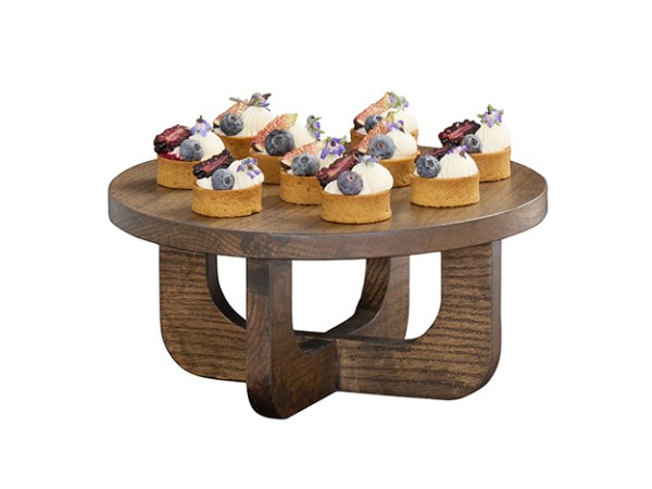 Add height and dimension with the Melrose Round Riser. This chocolate-brown oak riser with unique curved legs elevates displays naturally and elegantly - perfect for retail or buffet setups.